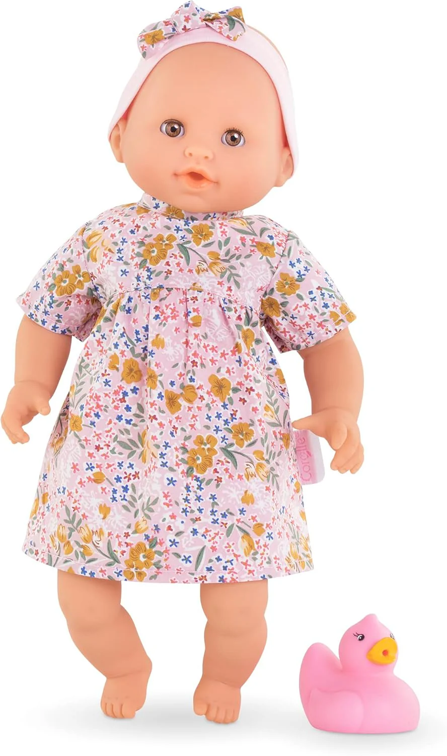 Badpop Calypso houdt ervan om te spetteren in het water! Dit waterspeelkameraadje helpt kinderen ook om langzaam vertrouwd te raken met alle soorten wateromgevingen: • badkuip (zeepwater) • zwembad (chloorwater) • zee (zout water). Er zit een lusje op de rug van de pop genaaid, zodat deze kan worden opgehangen om te drogen als het badderen of spelen met water voorbij is. Het formaat van 30cm past perfect in de kleine armen van je kind en is ideaal om te knuffelen. Het hoofd en de ledematen van de pop zijn gemaakt van zacht vinyl dat licht geparfumeerd is met vanille, een kenmerk van Corolle. Het zachte lichaam zorgt ervoor dat het dezelfde houdingen kan aannemen als een echte baby, en zijn bruine slaperige ogen sluiten zich wanneer het wordt neergelegd voor een dutje of voor het slapengaan. Calypso is gekleed in een schattig jurkje met bloemetjes print en draagt een bijpassende haarband en compleet met haar eigen badspeeltje in de vorm van een roze eend. Leeftijd 18 maanden en ouder.
