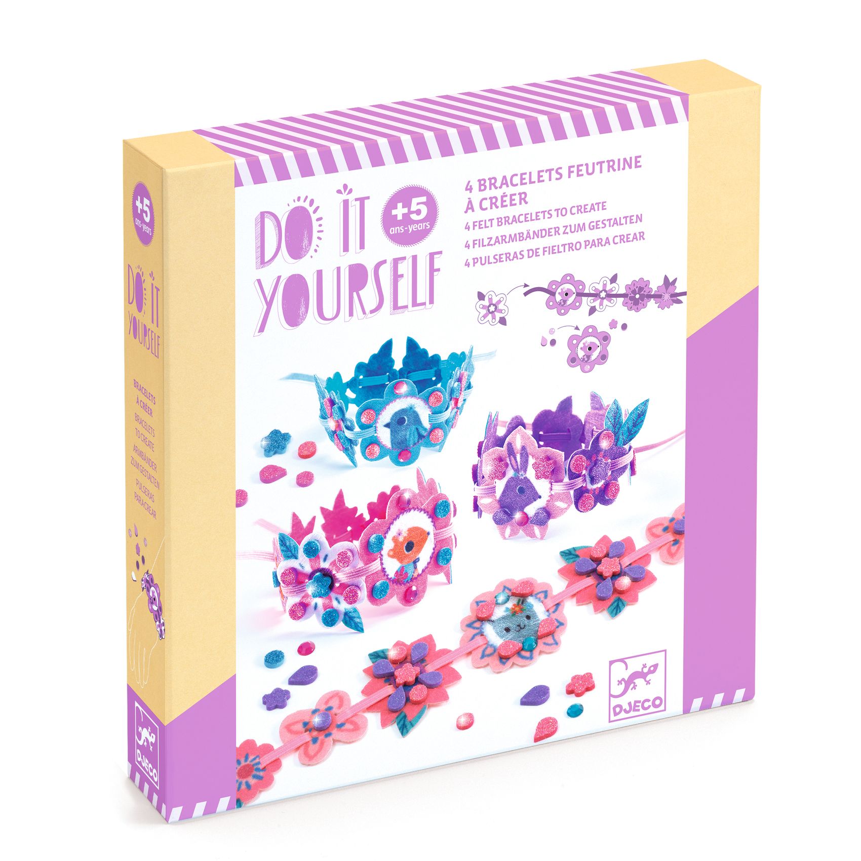 Inhoud: 28 voorgestanste stukjes vilt (7 stuks per armband), 4 elastiekjes van stof, 4 vellen glinsterende foamstickers, 1 vel zelfklevende edelstenen, 4 ronde naalden, 1 algemene stapsgewijze handleiding en 4 patronen om te volgen voor elke armband