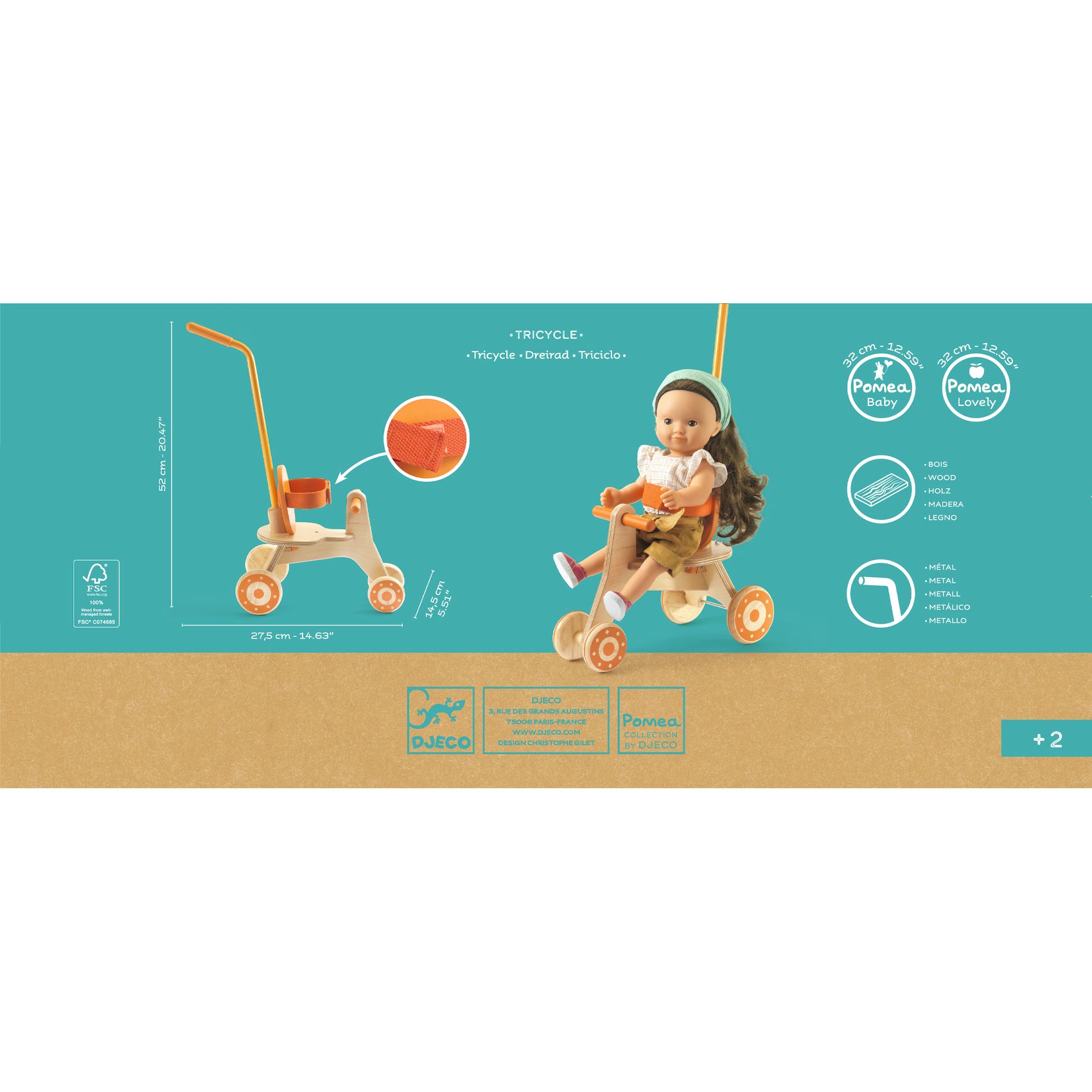 Heerlijk met je pop op stap. Nu eens niet in een popopenwagen, maar op een driewieler. Een mini-driewieler, perfect formaat voor poppen. Comfortabel en veilig dankzij de verstelbare riem, zijn poppen en babypoppen klaar voor een ritje in de tuin of slaapkamer. Kinderen zullen er dol op zijn.
