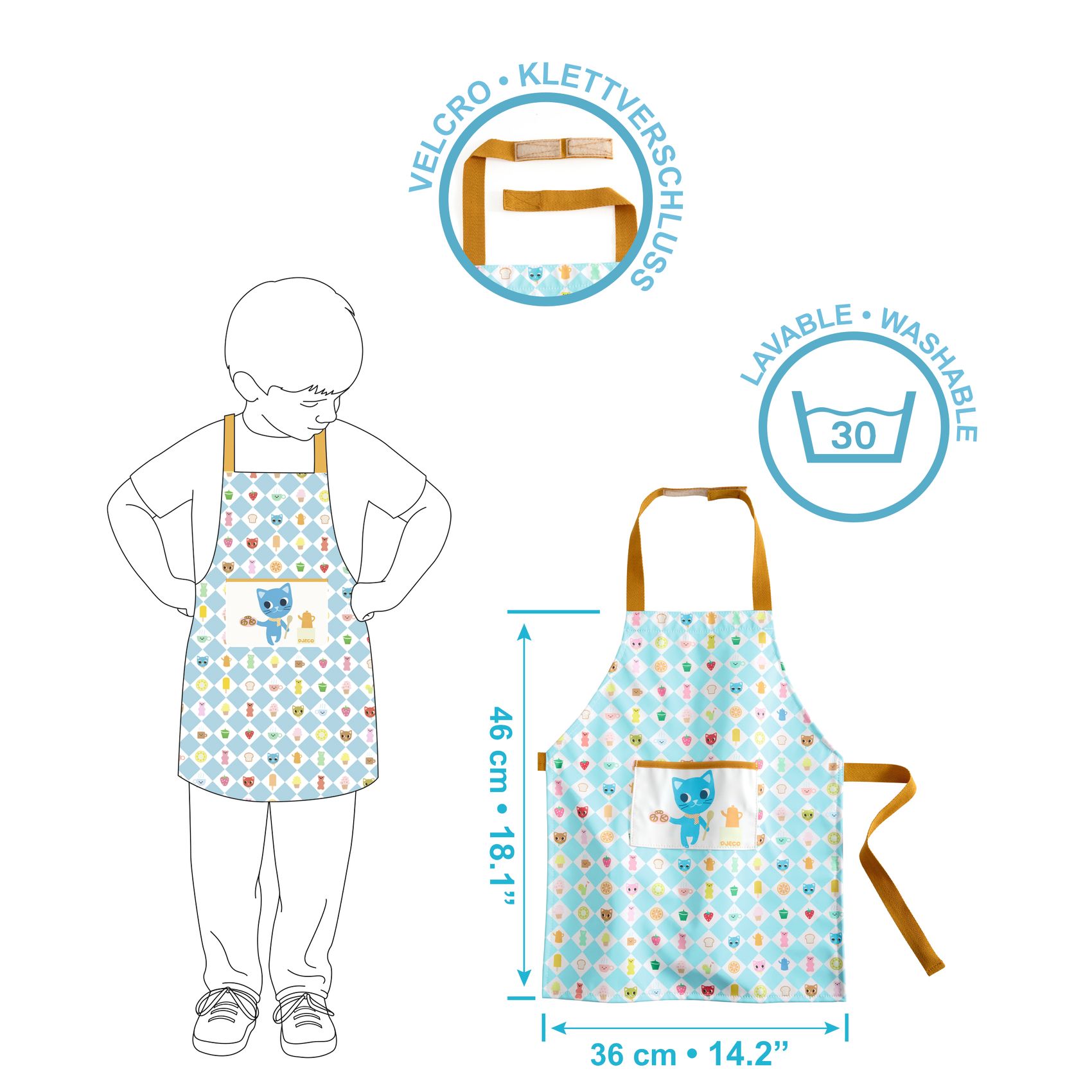 Samen met papa en/of mama gezellig in de keuken eten koken? Dan is deze schort heel handig. Mocht er geknoeid worden, dan beschermt dit schort je kleren, ook handig als je gaat schilderen of knutselen. Of gebruik hem in je speelkeuken. Eén maat voor kinderen tot een jaar of vijf  met een verstelbare nekband met klittenbandsluiting en een tailleband voor een nauwsluitende pasvorm.