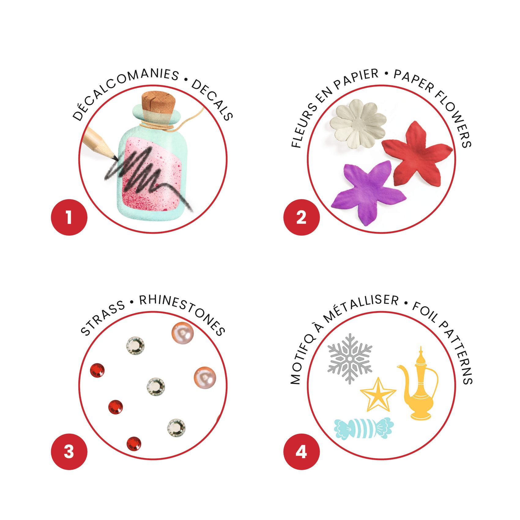 Inhoud: Decals, papieren bloemen, 100 zelfklevende strass-steentjes, metallic designs.