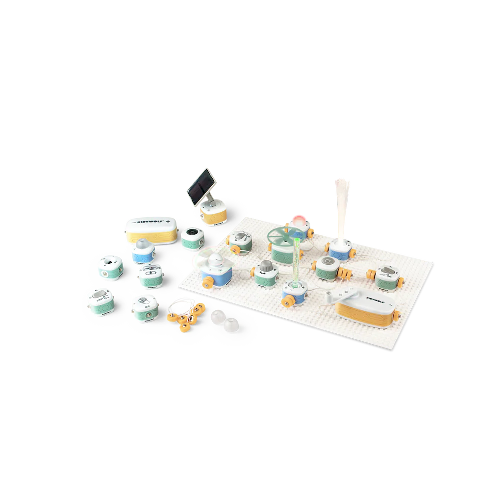 Inhoud: 3 roosters, 18 elektronische blokken om in elkaar te zetten, 15 connectoren, klein pedagogisch boekje met stap-voor-stap instructies, te downloaden via QR-code, gebruiksaanwijzing