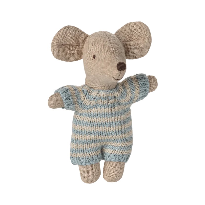 Superschattig is deze kleine babymuis in een draagmandje. De muis draagt een blauw gestreept gebreid pakje en het draagmandje is van bloemetjesstof.